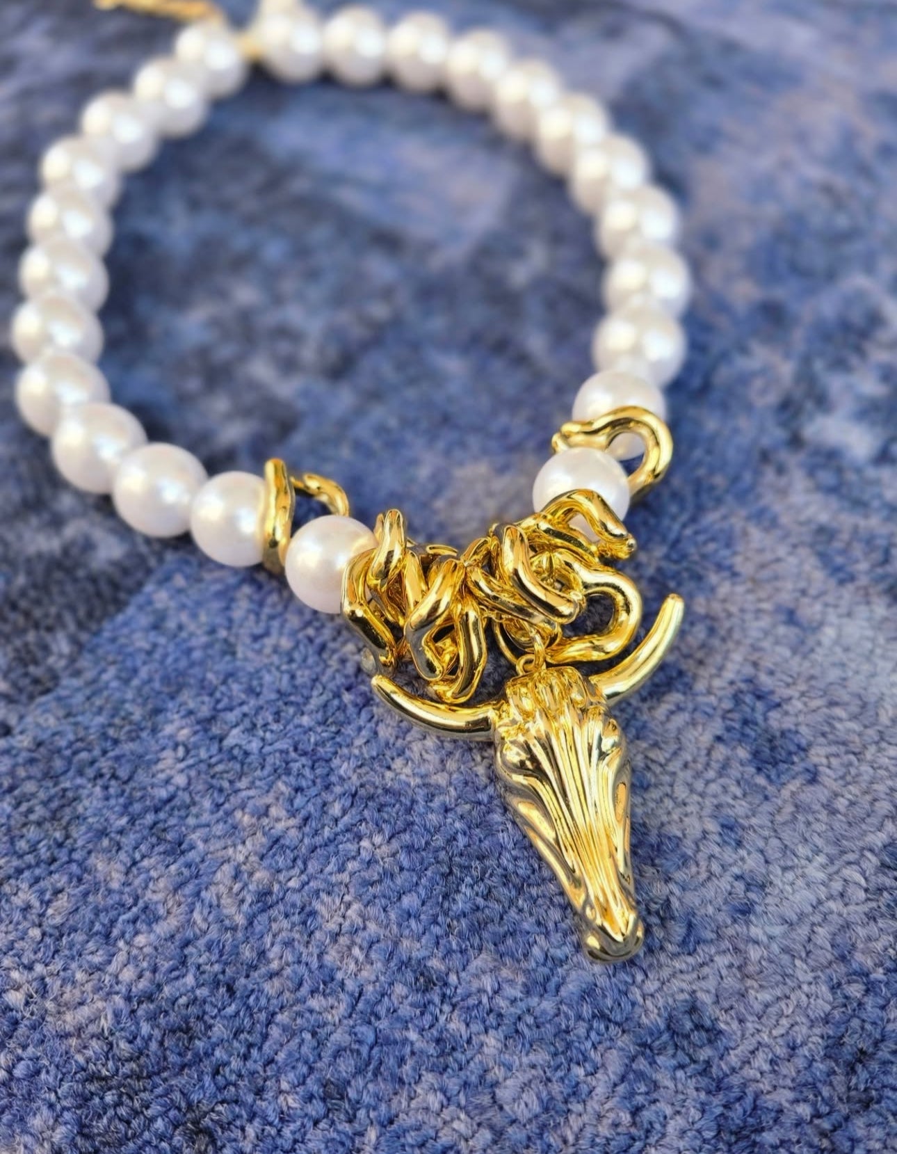 Collar de perlas sintéticas XL con cadena ajustable, aros y dije de cráneo estilo vaquero laminado de oro de 18K.